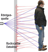1. Röntgenstrahlen mit extrem geringer Dosis (blau) werden von der Körperoberfläche auf den Detektor zurückgestreut (rot).