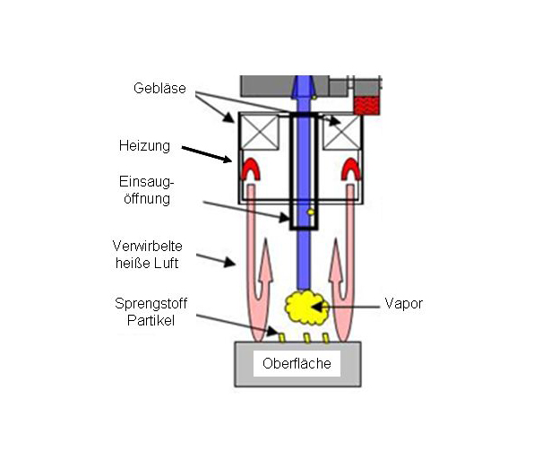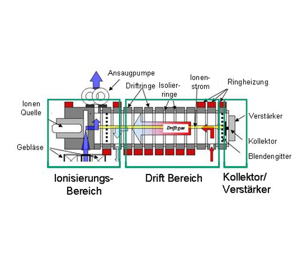 Bei dem QS-H150 wird durch ein Gebläse mit vorgeschalteter Heizung ein Luftstrom erzeugt. Dabei werden die Partikel aus der Oberfläche herausgelöst und über einen zentralen Luftkanal einer Messkammer zugeführt. Die Ionisierung (negativ) der angesaugten organischen Moleküle erfolgt dann durch ein UV-Lichtbasiertes System. Somit entfällt der Einsatz einer sonst üblichen radioaktiven Quelle! Ein elektrisches Feld in einer Driftröhre beschleunigt dann die Ionen. Aufgrund der molekularspezifischen Ionen-Drift-Geschwindigkeit wird durch Vergleich mit Datenbankeinträgen die Substanz präzise ermittelt.
